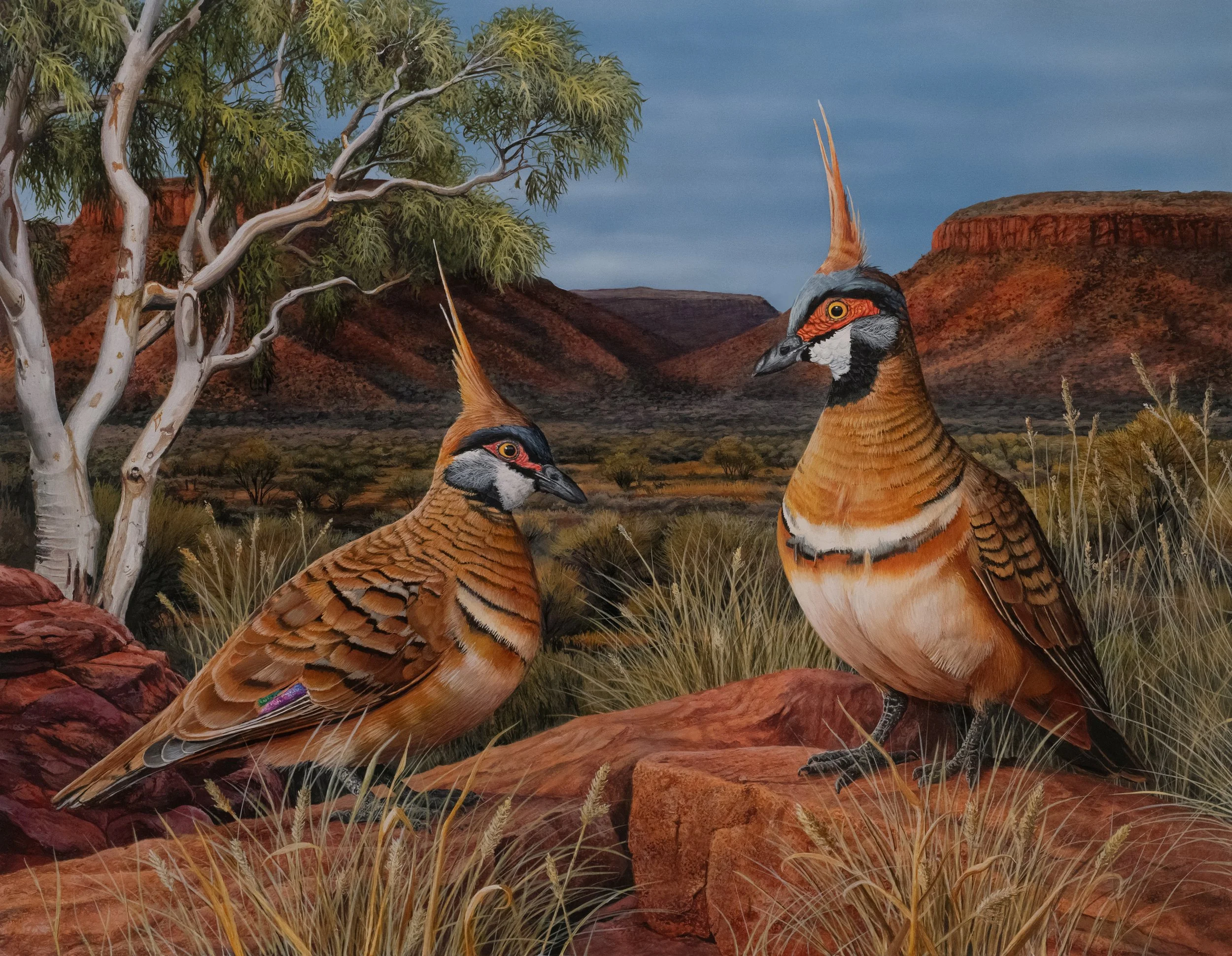 Golden-shouldered Parrots 2022 Acrylic on board.